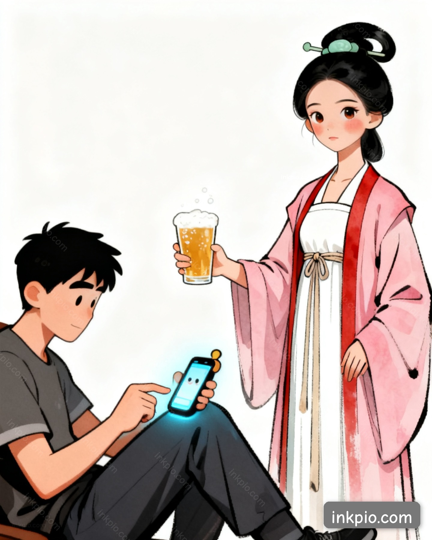 The first customer slouched through the entrance looking like he hadn't slept since Tuesday. Before he even found a stool, his thumbs started flying across the screen to reply to a midnight email. Li Qingzhao swept her embroidered sleeve over his lap and slid a foamy mug across the polished wood. The glowing device vanished beneath the heavy fabric, replaced by a quiet moment that actually smelled like roasted malt and real peace. He stared at the glass, disarmed by the sudden silence and the absence of vibrating pockets.
