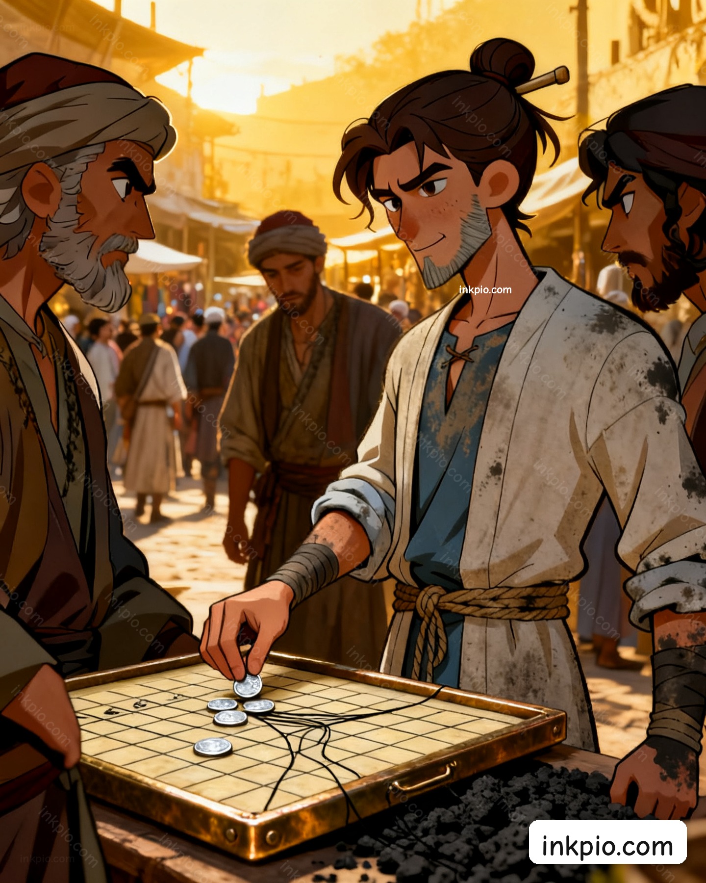 He held the tablet up to the lead trader. The man leaned in, tracing the charcoal lines with a calloused thumb. He found his own marked square, counted the intersections, and the anger drained out of his posture. The others crowded around, dropped their silver markers onto the matching spots, and finally agreed. The market noise faded into focused silence as coins settled into their proper places. The grid held the chaos in check, leaving nothing to dispute.