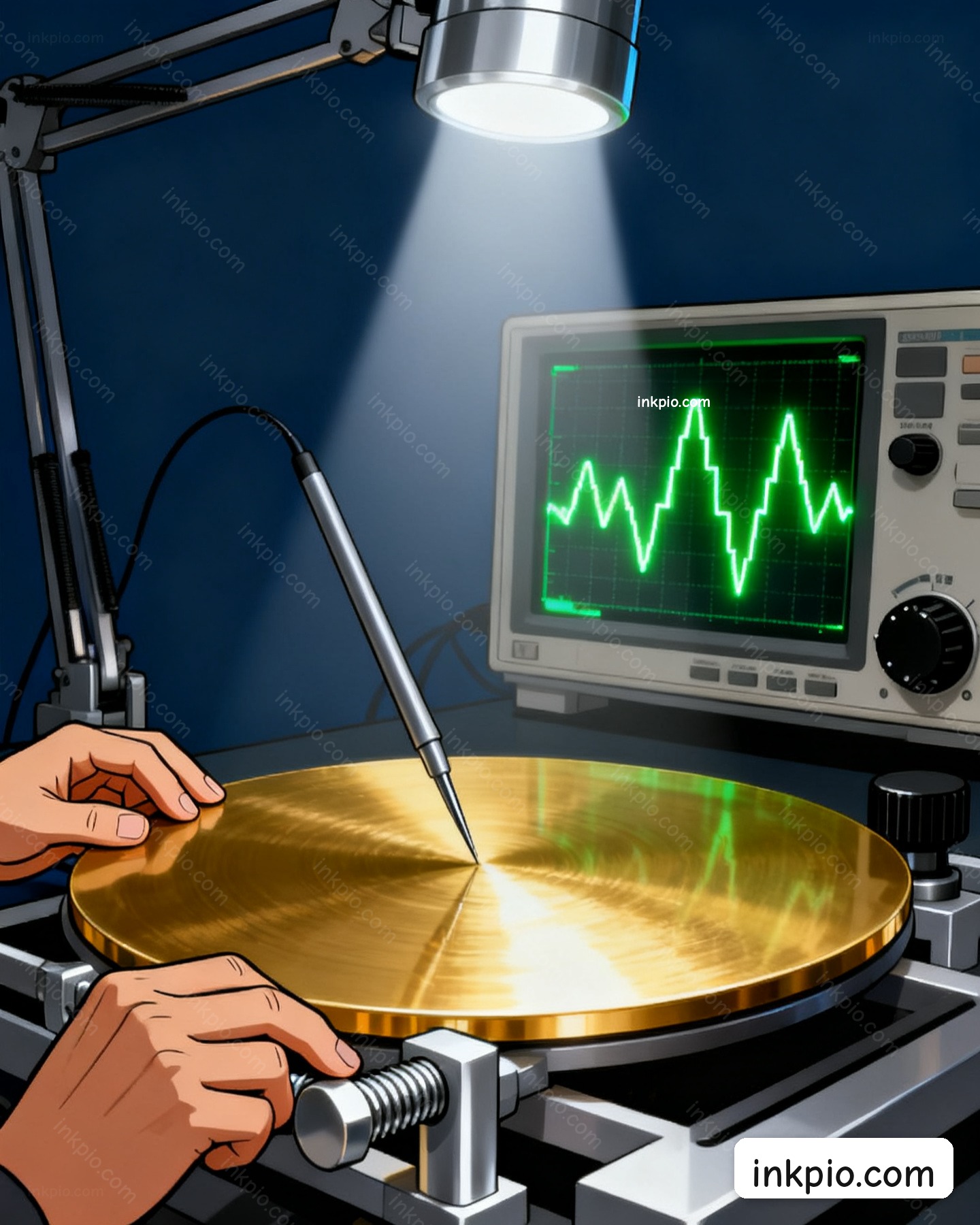 As the needle drifted across the gold, a feedback motor nudged it up and down to keep the electron flow perfectly steady. The tip tracked every microscopic hill and valley, translating those tiny hops into clean voltage signals. The oscilloscope screen flickered to life, tracing a jagged staircase of peaks. A flawless hexagonal grid slowly emerged from the static. They were finally reading a topographic map of individual atoms.